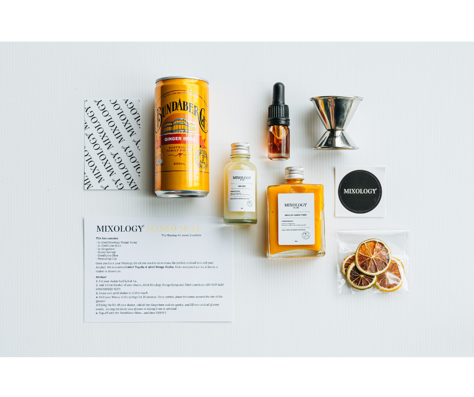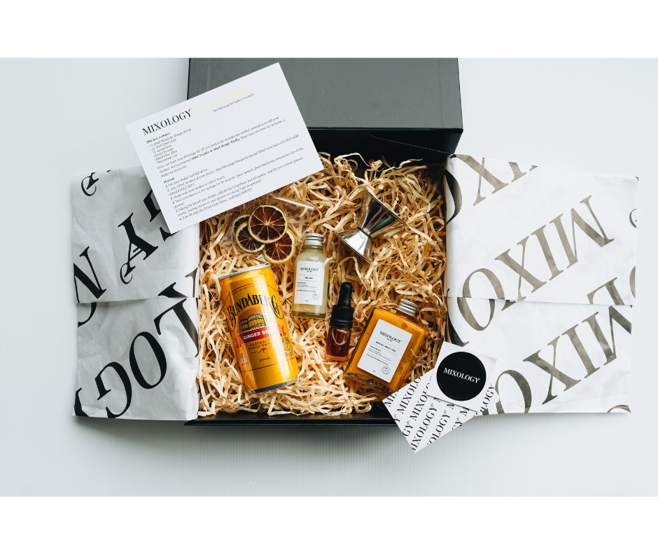Mixology gift box kit comes in a smart cocktail gift box with nearly everything you need to make two Mango Mule mocktails (great as a cocktail – no added Alcohol, recommendation included)